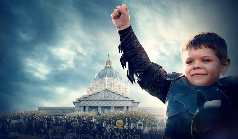美國5歲男童邁爾斯·斯科特,在1歲半時被診斷出患上白血病。他決定像他最愛的超級英雄“蝙蝠俠”對抗壞人一樣,勇敢面對病魔。知道了這件事的人們決定幫他圓夢:2013年11月15日,在舊金山全城的幫助下,他當了一回“蝙蝠俠”。這個故事將被拍成紀錄片《小蝙蝠俠出擊(BatkidBegins,對應BatmanBegins)》,導演達娜·納克曼在今年聖疊戈動漫展上放出了預告,計劃籌集10萬美元資金完成這個紀錄片。