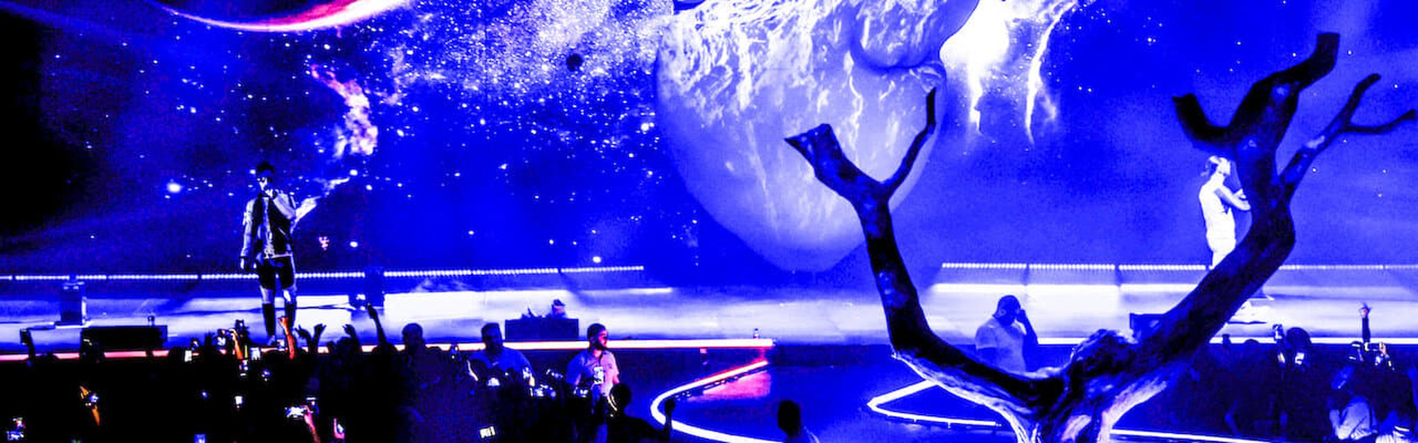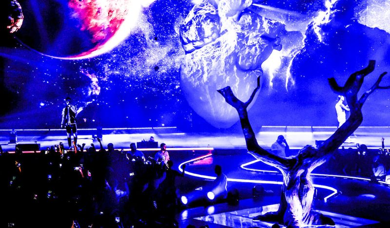 法國饒舌雙人團體 PNL 在巴黎貝爾西體育館登台,表演專輯《Dans la légende》裡的熱門歌曲,還為觀眾帶來令人迷炫的視覺效果。