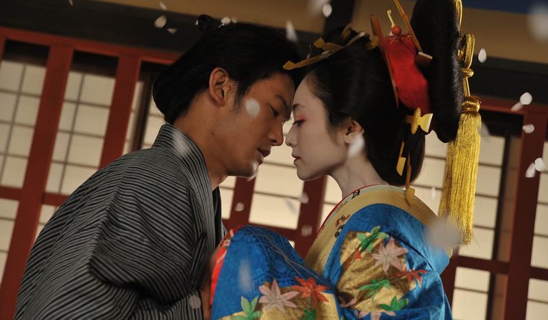 無可逃避的命運浪濤之中,一生一次的戀愛絢爛綻放。 江戶末期,新吉原的山田樓裡有一群遊女,懷抱著無法成真的戀情,她們是最豔麗的花朵,香氣襲人,甜美芳醇,卻註定在開到荼靡之後自謝自落,無人聞問。“道中”是指第一次出道的青樓女子,從青樓走到恩客面前的這一小段路,穿上華麗的和服,猶如花魁一般的遊行,這是所有遊女們的夢想。 然而大妓樓被私奔的遊女放火給燒了,所以遊女朝霧(安達祐實 飾)沒能如願道中。朝霧是吉原當紅的頭牌,不相信愛情的她,偏偏愛上了和服師傅半次郎(淵上泰史 飾),在他身上她感受到有生以來初次的悸動,過往未曾體會的女人心境也逐漸甦醒。為了替朝霧道中,半次郎製作出絕世的和服,藍色的牡丹在月光下一朵朵地綻放…然而,吉原的遊女只要有了戀人,就是有罪…。吉原,是個牢籠,籠住的不只是現在,連未來也是。